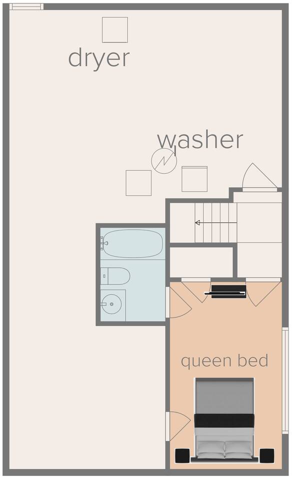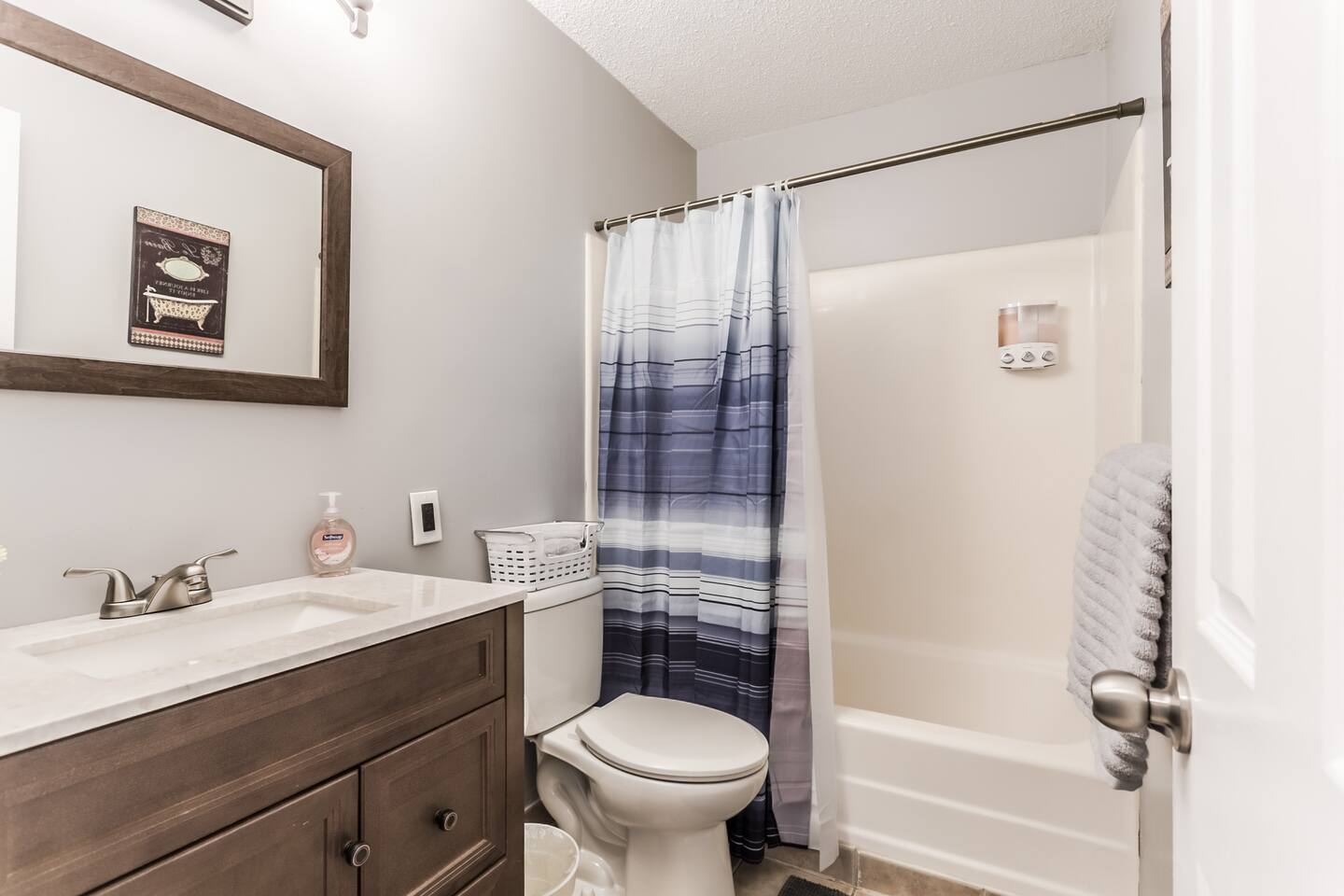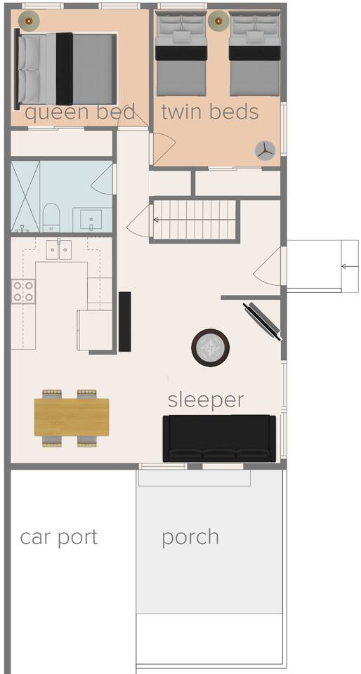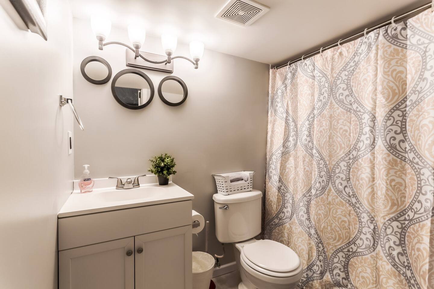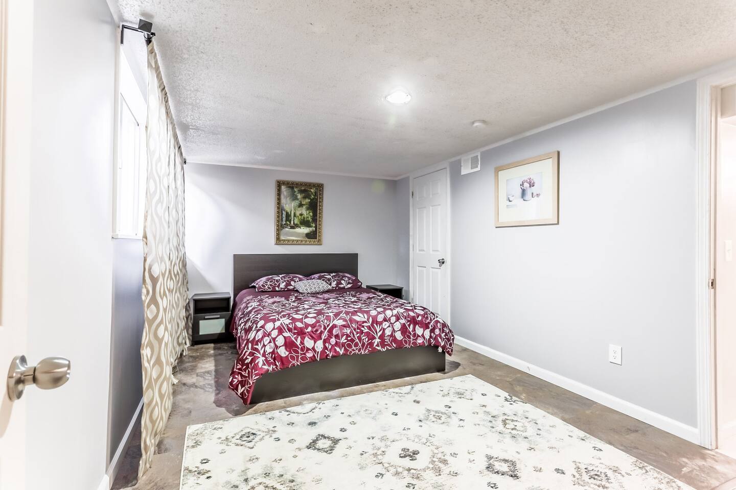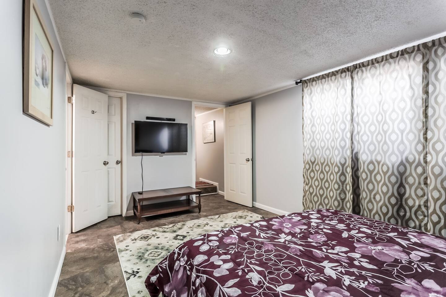 On the main (ground) level there are kitchen, living room , two bedrooms and the bathroom. New kitchen with all new appliances. Spacious living room with sofa-sleeper, coffee table with small ottomans and large TV. There is queen size bed in one bedroom and two twin beds in another. There's another queen size bed in the downstairs living area with separate bathroom and TV. See the other half listed here: https://www.airbnb.com/rooms/21868618